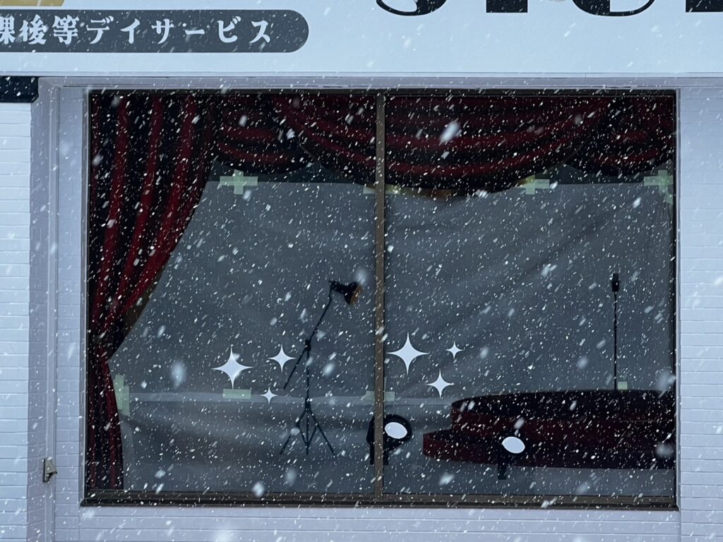 窓ガラス全面サイズの透明塩ビシートにデザインを出力して施工しています。